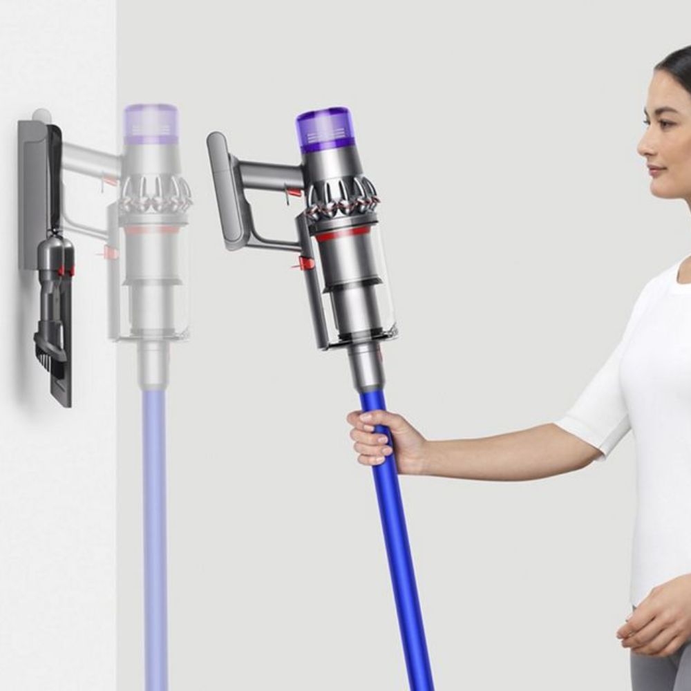 Wall-mounted Dock to recharge your vacuum and tidily store tools.