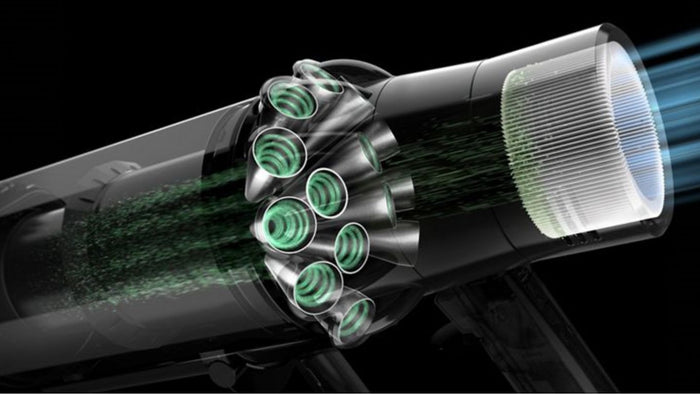 14 cyclones generate forces of more than 79,000g to fling microscopic particles – such as pollen and bacteria – into the bin.