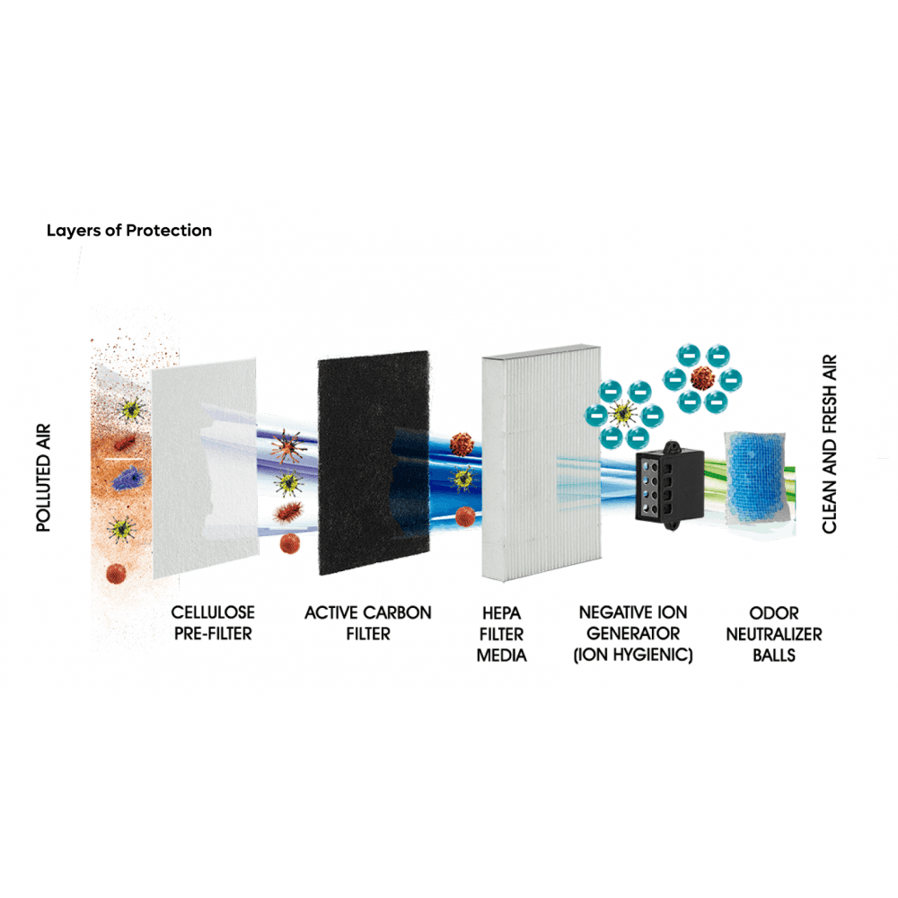 Before the air reaches your hands, it has to pass through a HEPA filter medium that includes a pre layer and carbon filter to make sure it catches 99.9% bacteria, leaving a superior air quality to dry with. The ioniser users Ion Hygienic technology that cleans and purifies the air in the washroom through the emission of anions, eliminating most germs and particles transported through the air.